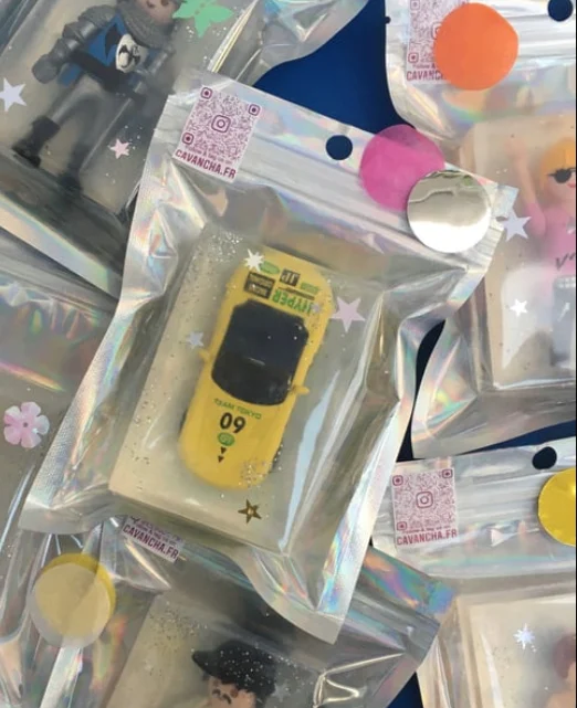 Aqua, Glycérin ( émollient d’origine végétale, colza ), Sodium cocoate ( huile de coco saponifiée ), Sorbitol ( sucre, hydratant ), Sodium stearate ( sel saponifié d’acide stéarique d’origine végétale, colza ), Butylène glycol (émollient et hydratant d’origine végétale, maïs ), Cocamidopropyl betaine ( tensioactif d’origine végétale, coco ), Sodium chloride ( sel ), Sodium citrate ( sel d’acide citrique ), Cocos nucifera oil ( huile végétale de coco ), polyglyceryl-4-oleate ( émulsifiant d’origine végétale, colza, olive ), citric acid ( acidifiant ), geraniol, linalol, jouet vintage et paillettes biodégradables ( JUST FOR FUN ! ) issues de plantes.