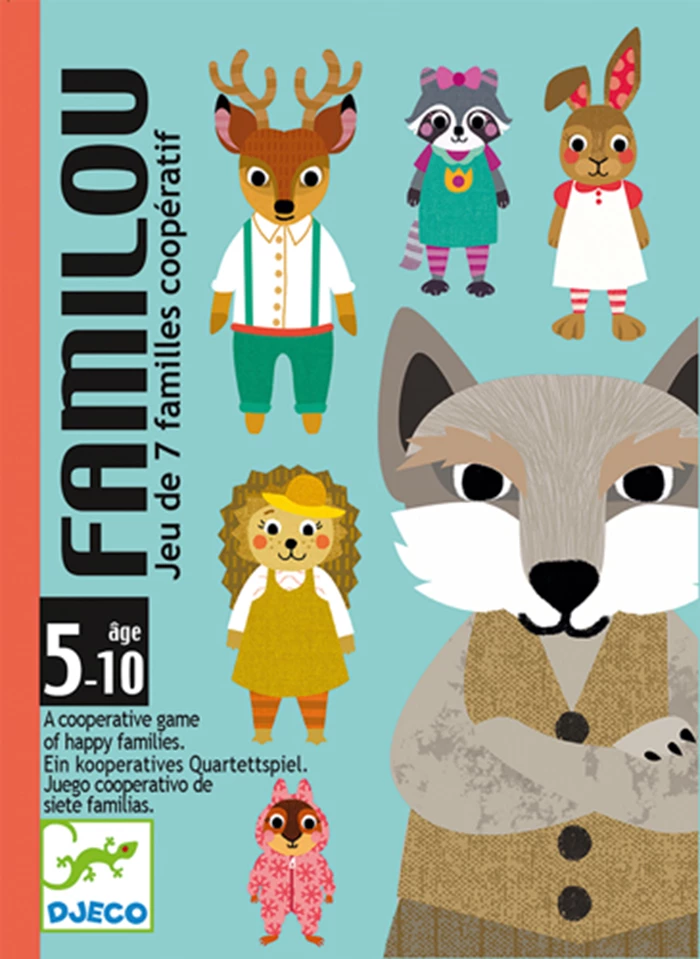 Un jeu des sept familles coopératif dans lequel tous les joueurs tentent de recomposer en même temps sept familles avant l’arrivée du loup.