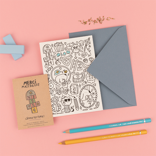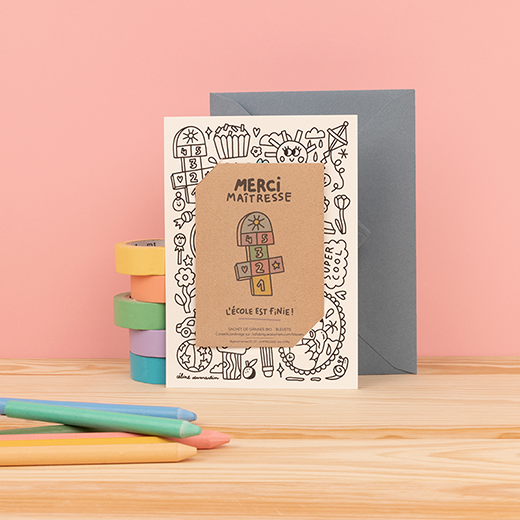 Choisissez un cadeau merci maîtresse personnalisable par les enfants eux-mêmes. Notre carte à colorier et à semer leur permet de s’investir plus personnellement dans les remerciements de fin d’année scolaire qu’ils transmettront à leur institutrice favorite.