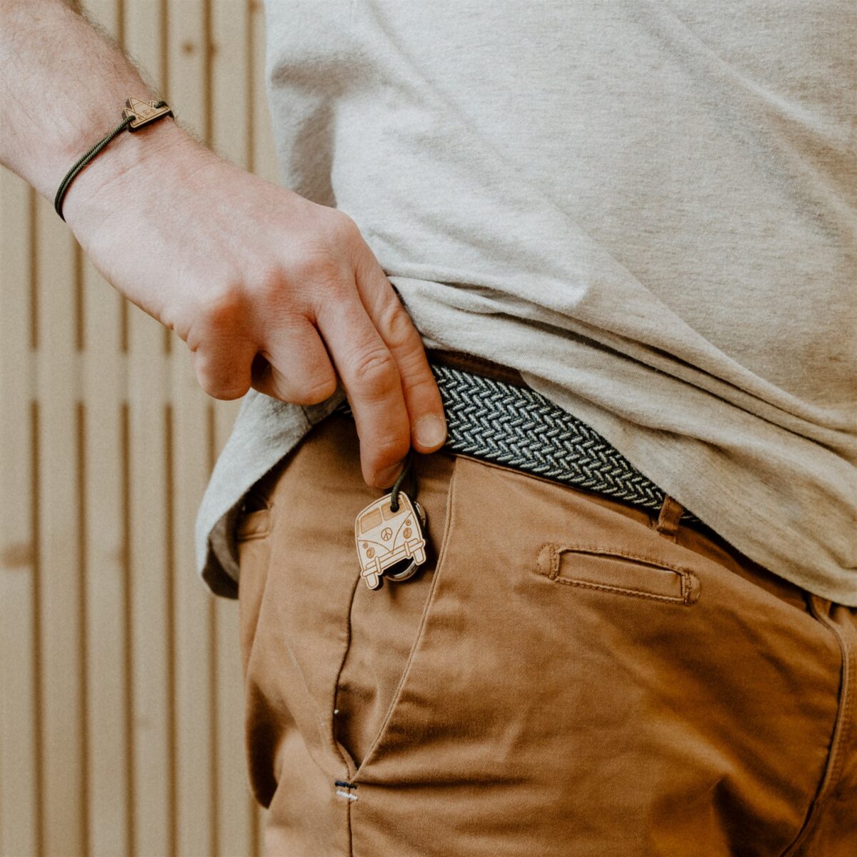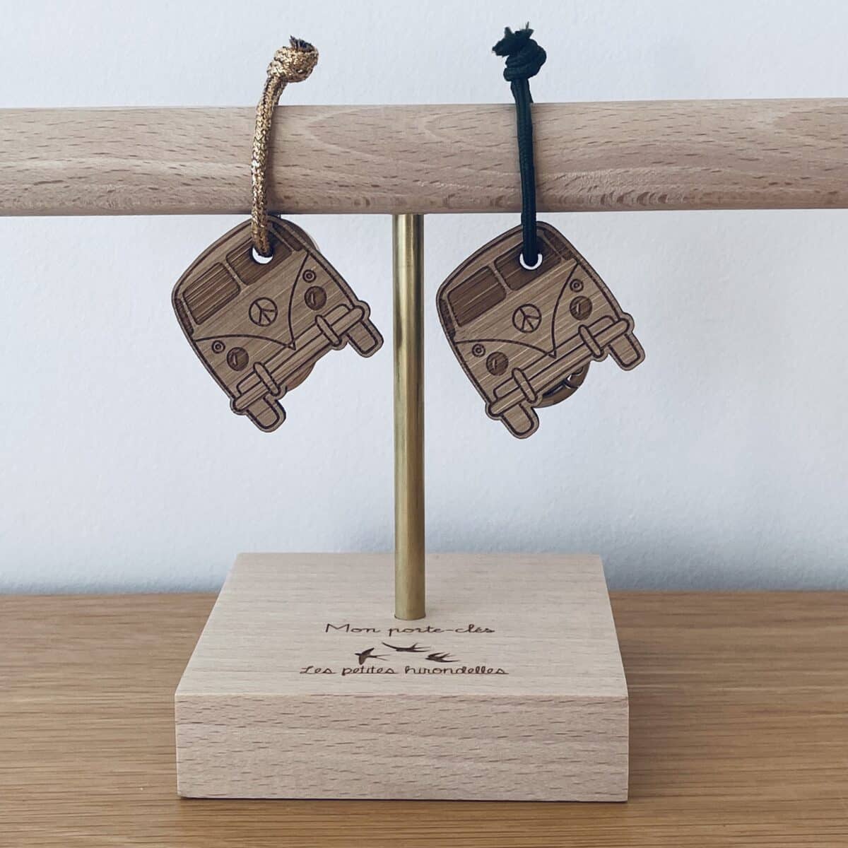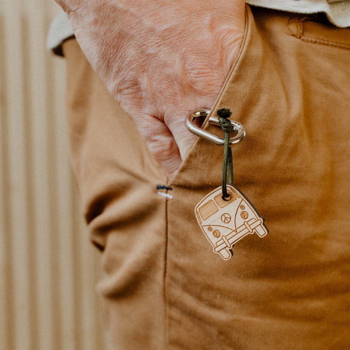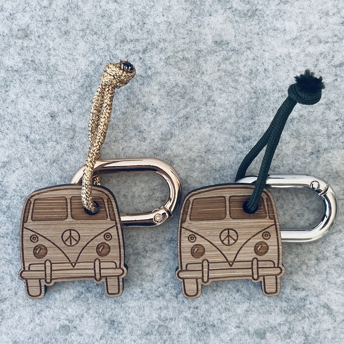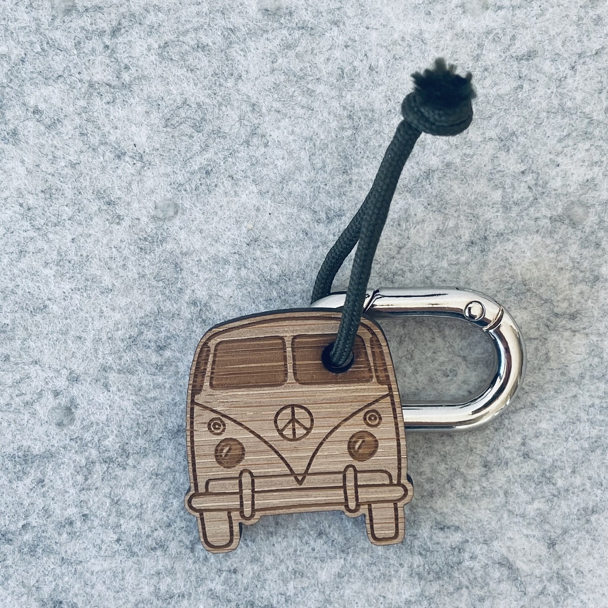 Il est composé d’un petit motif en bois gravé avec de beaux détails, d’environ 3-4 cm et d’un mousqueton en métal, très pratique pour y glisser vos clés, le tout relié avec une cordelette.