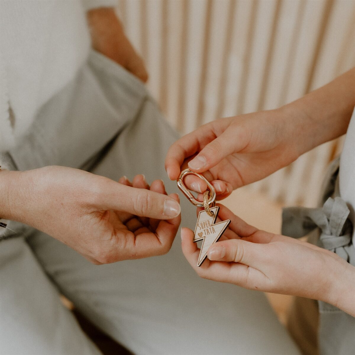 Il est composé d’un petit motif en bois gravé avec de beaux détails, d’environ 3-4 cm et d’un mousqueton en métal, très pratique pour y glisser vos clés, le tout relié avec une cordelette.