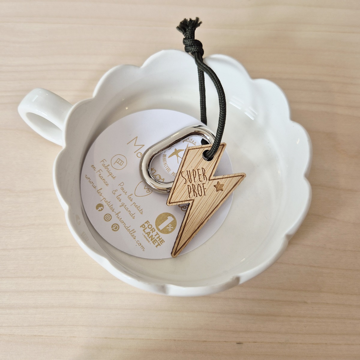 Notre joli porte-clés en bois est composé d’un cœur ou d’un éclair avec l’inscription “super prof”, d’environ 3-4 cm et d’un mousqueton en métal, très pratique pour y glisser vos clés, le tout relié avec une cordelette.