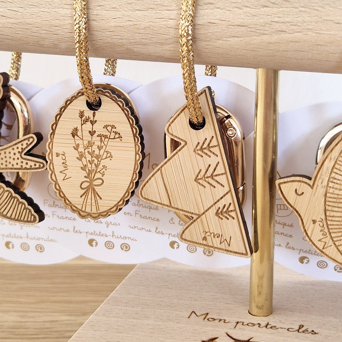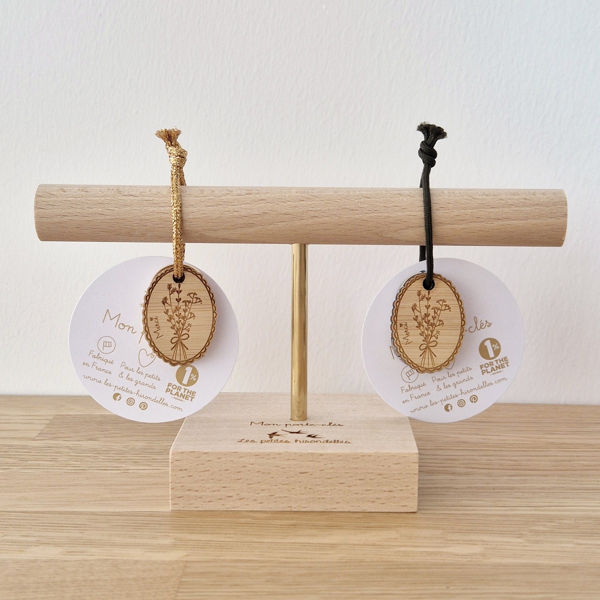 Notre joli porte-clés en bois est composé d’un petit motif en bois gravé avec de beaux détails et une inscription « Merci », d’environ 3-4 cm et d’un mousqueton en métal, très pratique pour y glisser vos clés, le tout relié avec une cordelette.
