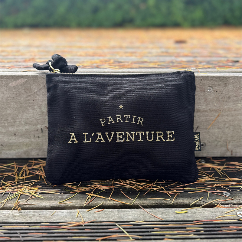 Craquez sur notre jolie pochette couleur noire avec son imprimé or pailleté » Partir à l’aventure « . 100% coton 320 g/m2 , entièrement doublée coton noir Fermeture éclair or et son petit noeud en tissu attaché à la tirette. Imprimé or pailleté Dimensions: 16×21