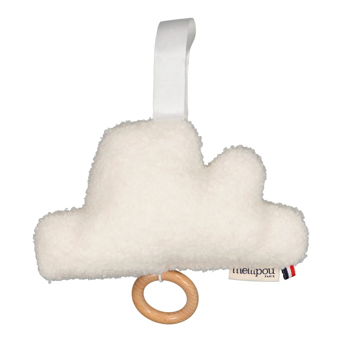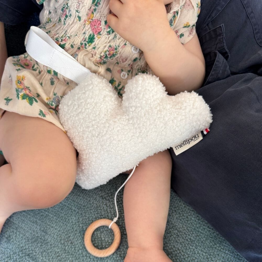 Boite à musique en forme de nuage. la peluche musicale nuage avec une berceuse tendance! Sa douce mélodie est moderne et apaisante pour les enfants en cas d’insomnies ou gros chagrins. Ce jouet musical original made in France est également un objet de décoration. A suspendre au dessus du lit pour rêver la tête dans les nuages! Cet objet musical en forme de nuage est réalisé à la main avec des matériaux responsables et de tissus certifiés Oeko-Tex. Mellipou respecte également les normes CE, pour que les enfants s’épanouissent en toute sécurité! Il sert également de doudou, et est parfait si vous êtes à la recherche de cadeaux de naissance ou de noël … Un nuage musical pratique à emporter partout, mais surtout 100% lavable en machine grâce à son mécanisme étanche! Ce doudou musical moderne plaît au bébé ET aux parents! Les parents en sont fan et ont déjà la musique dans la tête!