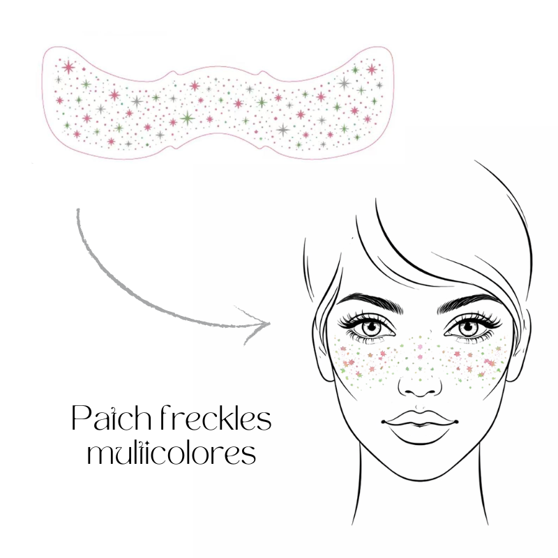 Apportez une note joyeuse et créative à votre look avec les freckles multicolores, un tatouage éphémère délicat qui transforme votre visage en véritable constellation colorée. Inspiré de la tendance des taches de rousseur décoratives, ce motif associe de petites étoiles et des points fins dans plusieurs teintes lumineuses pour un résultat frais et pétillant.